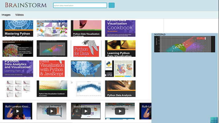A web app that helps users brainstorm ideas by showing media relevant to search terms and allowing users to quickly copy them down to the notepad.